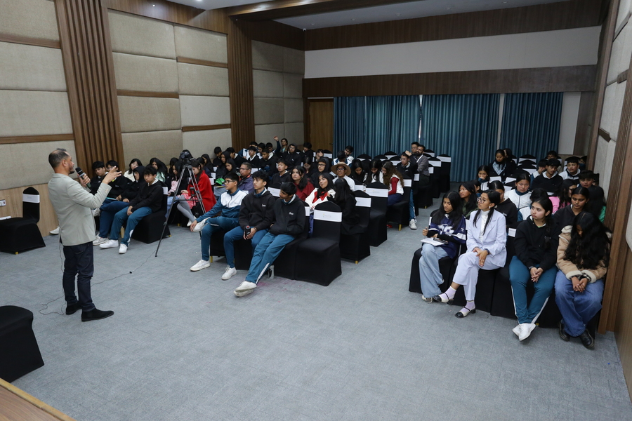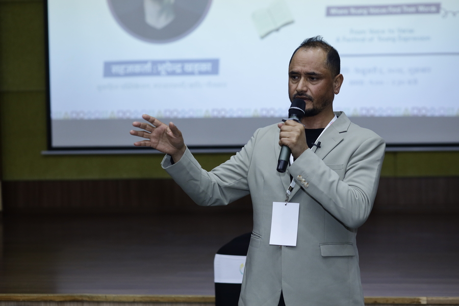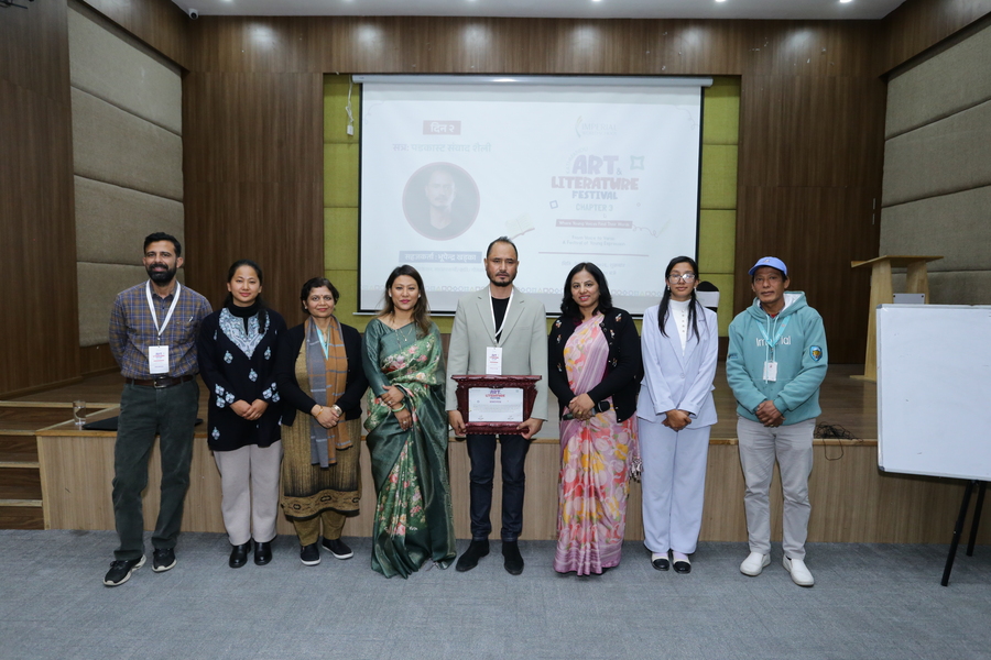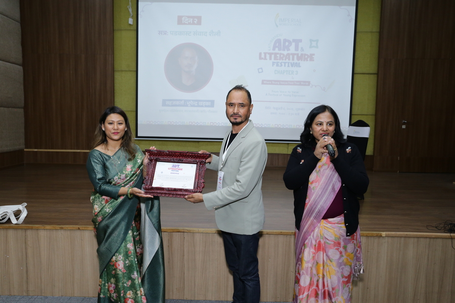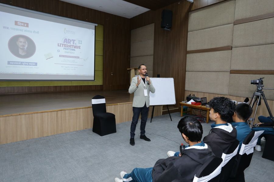 KALF Chapter 3 अन्तर्गत नेपाली विभागद्वारा आयोजित “पडकास्ट–संवाद शैली” सत्रमा भुपेन्द्र खड्काज्यूले पडकास्टका माध्यमबाट संवाद कसरी प्रभावकारी, सशक्त र आकर्षक बनाउने भन्ने विषयमा व्यवहारिक ज्ञान साझा गर्नुभयो। यस सत्रले विद्यार्थीहरूलाई आधुनिक सञ्चार माध्यम, प्रस्तुतीकरण कला र अभिव्यक्ति कौशल विकास गर्न प्रेरित गर्‍यो।