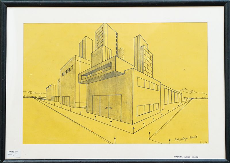 This is a simple cityscape made on yellow chart paper with the help of a two-point perspective. Every line in this art piece either points up down or to the two points.